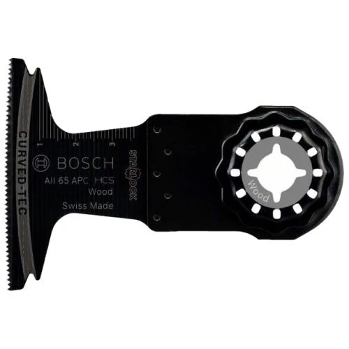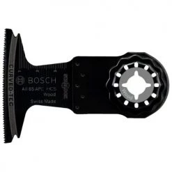 La lame de scie oscillante AII 65 APC de la marque Bosch dispose d’une arête de coupe arrondie (Curved-Tec) pemettant une coupe plongeante précise et régulière dans le bois. Son design plat, son corps de base conique et son interface 3D minimisent le balancement et augmentent la précision, grâce à une transmission de puissance optimale directe. Cette conception permet également une élimination rapide des copeaux. Le système de fixation Starlock « Snap-In » permet un changement rapide et sans outil de la lame. En outre, la AII 65 APC convient aux outils électroportatifs Starlock, Starlock Plus et Starlock Max ainsi qu’aux outils multifonctions standard.