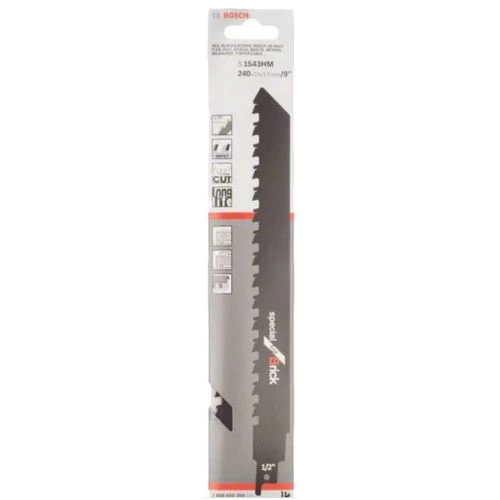 La lame de scie sabre S 1543 HM Endurance for Brick bénéficie d’une durée de vie maximale tout en offrant une coupe rapide dans les matériaux spéciaux. Les dents en carbures sont faites pour des découpes de matériaux abrasifs à base de minéraux. Grâce à une denture à très grand pas de 12,7 mm, la lame offre une coupe rapide et une stabilité optimale. En outre, cette lame de scie sabre S 1543 HM est pourvue d’une capacité de coupe allant jusqu’à 150 mm et d’une longueur de 240 mm. Elle est compatible avec les scies sabres filaires d’alimentation 1000 W minimum.