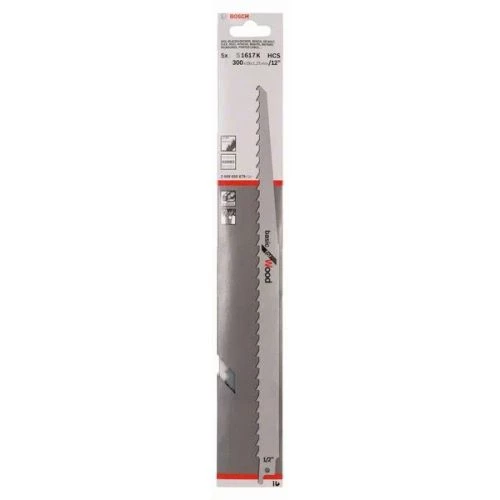La lame de scie sabre S 1617 K Basic for Wood de la marque Bosch présente une denture latérale acérée lui permettant de découper le bois sans exigence particulière. Elle est en acier à haute teneur en carbone (HCS), idéale pour la coupe du bois dur, du bois résineux, du bois de récupération sans clous, du bois de chauffage et du bois vert. Cette lame possède une capacité de coupe jusqu’à environ 250 mm. Enfin, elle est compatible avec les scies sabres avec systèmes d’emmanchement universel de 1/2’’.
