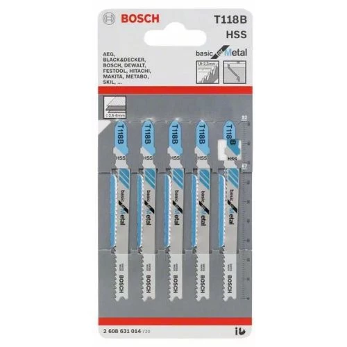 La lame de scie sauteuse T 118 B Basic for Metal de Bosch est l’outil idéal pour les découpes sans exigence particulières grâce à sa denture ondulée et fraisée. Cette lame convient pour la découpe des tôles standards non perforées grâce à sa conception en acier trempé à coupe rapide de haute qualité. La denture de lame à pas fin (1,9 à 2,3 mm) permet aussi la découpe d’une variété de tôles d’épaisseur moyenne de 2,5 à 6 mm.