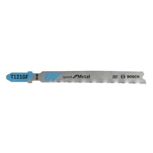 La lame de scie sauteuse T 121 GF Speed for Metal permet la réalisation de coupe fine avec une vitesse de coupe inégalée. La géométrie de ses dents bimetal en acier trempé HSS et en acier à haute teneur en carbone HCS flexible augmentent la vitesse de coupe sur tôle et la rend résistante à la rupture. Elle présente une denture à pas très fin (0,8 mm) et convient pour la découpe des tôles très fines d’une épaisseur de 0,5 à 1,5 mm et pour scies sauteuses avec systèmes de fixation en T.